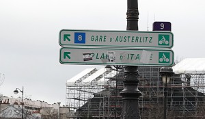 Pour savourer le puzzle, il faut savoir qu’en plus, sur le pont d’Austerlitz où se trouve ce panneau, on est déjà sur l’itinéraire 8. Je laisse les lecteurs trouver la solution pour comprendre la difficulté de l’exercice quand on est sur le vélo.
